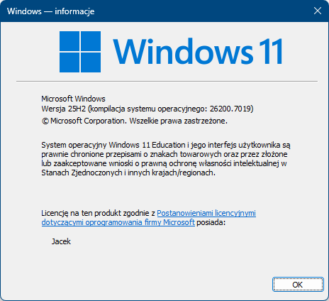 Na powyższym rysunku widzimy, że jest to Windows 11 z rocznicową aktualizacją 25H2 o kompilacji (dokładny nr wersji): 26200.7019. Jest to system w wersji Education (dla studentów i pracowników uczelni). W sprzedaży dla odbiorców niekorporacyjnych są wersje Home i Pro.